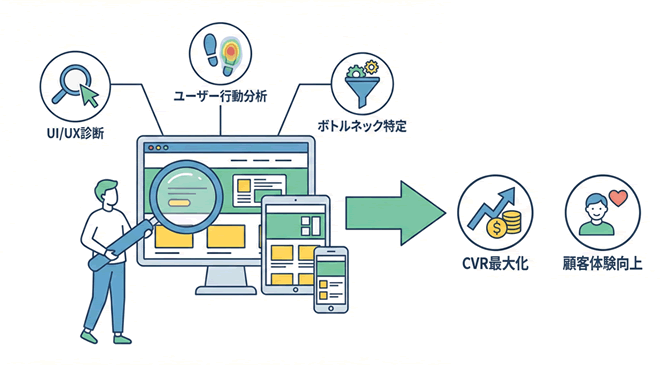 見た目を新しくするだけでなく、ユーザー目線で「成果を阻むストレスを取り除く」ことが目的です。全体の作り直しではなく、特定の箇所をデータに基づいて修正する「投資対効果の高い改善」を優先します。