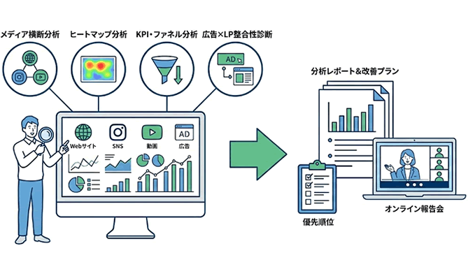 私たちの分析は、単なる過去の振り返りではありません。15年以上の現場実装経験に基づき、「実際に修正可能な粒度」でアクションプランを提示します。GA4やヒートマップ、さらにはSNSや広告を横断した「多角的な視点」から、「確実な判断基準」を提供します。